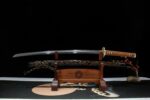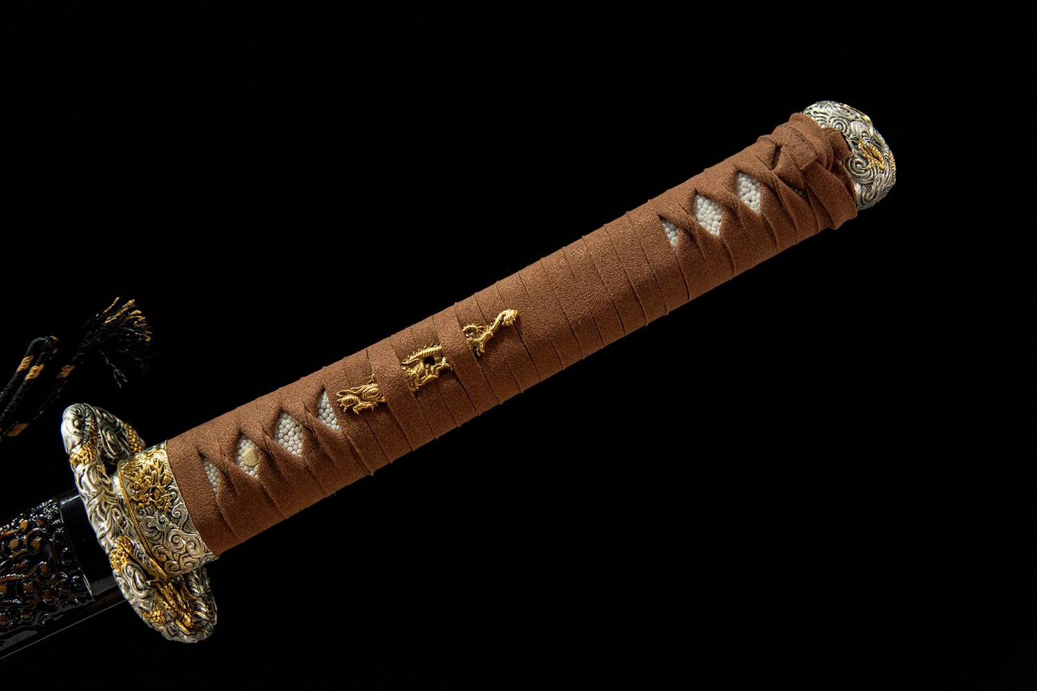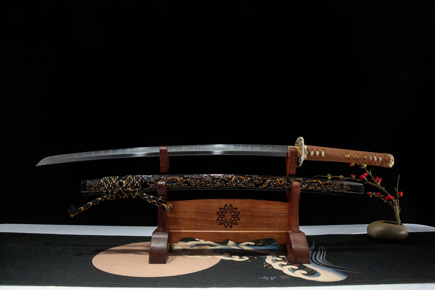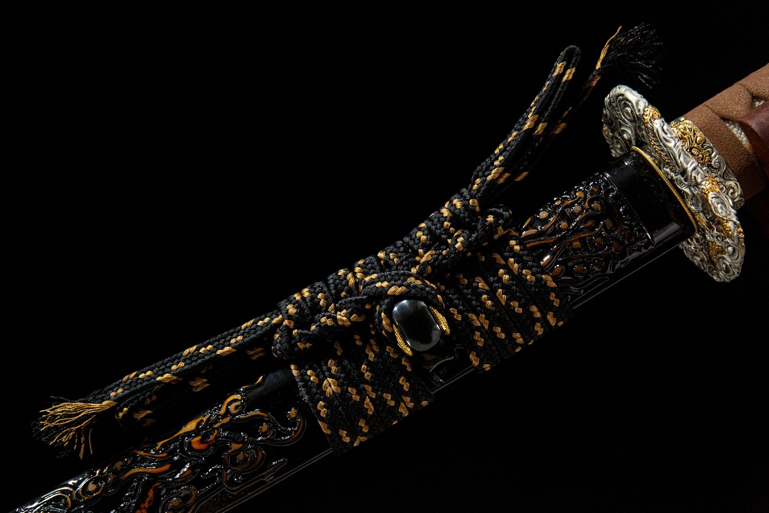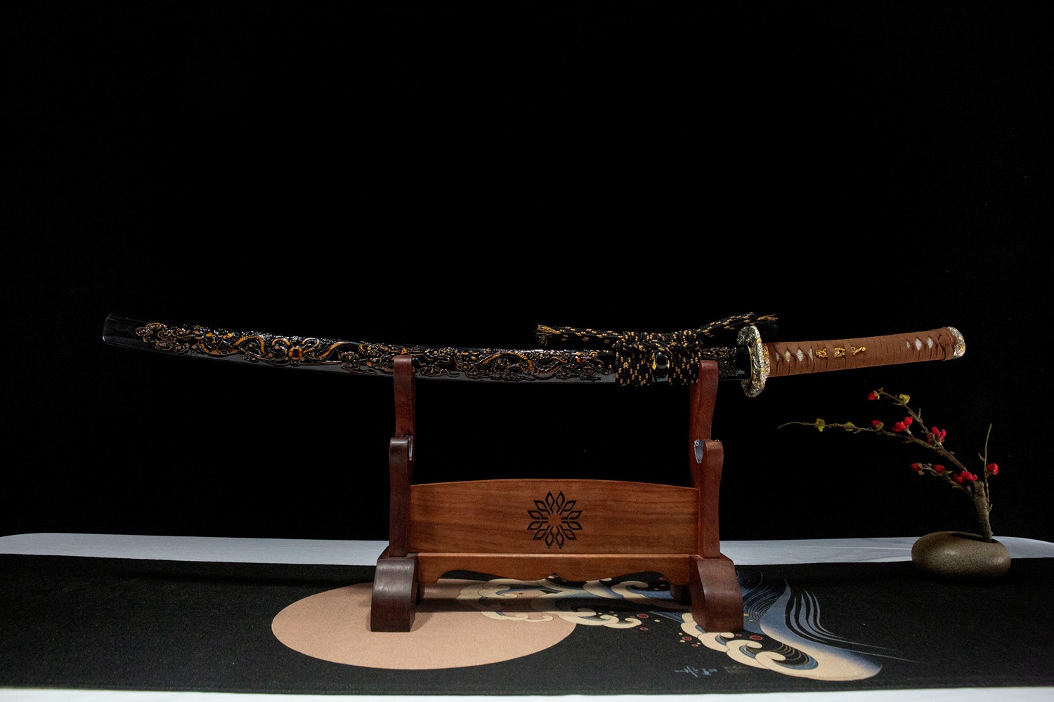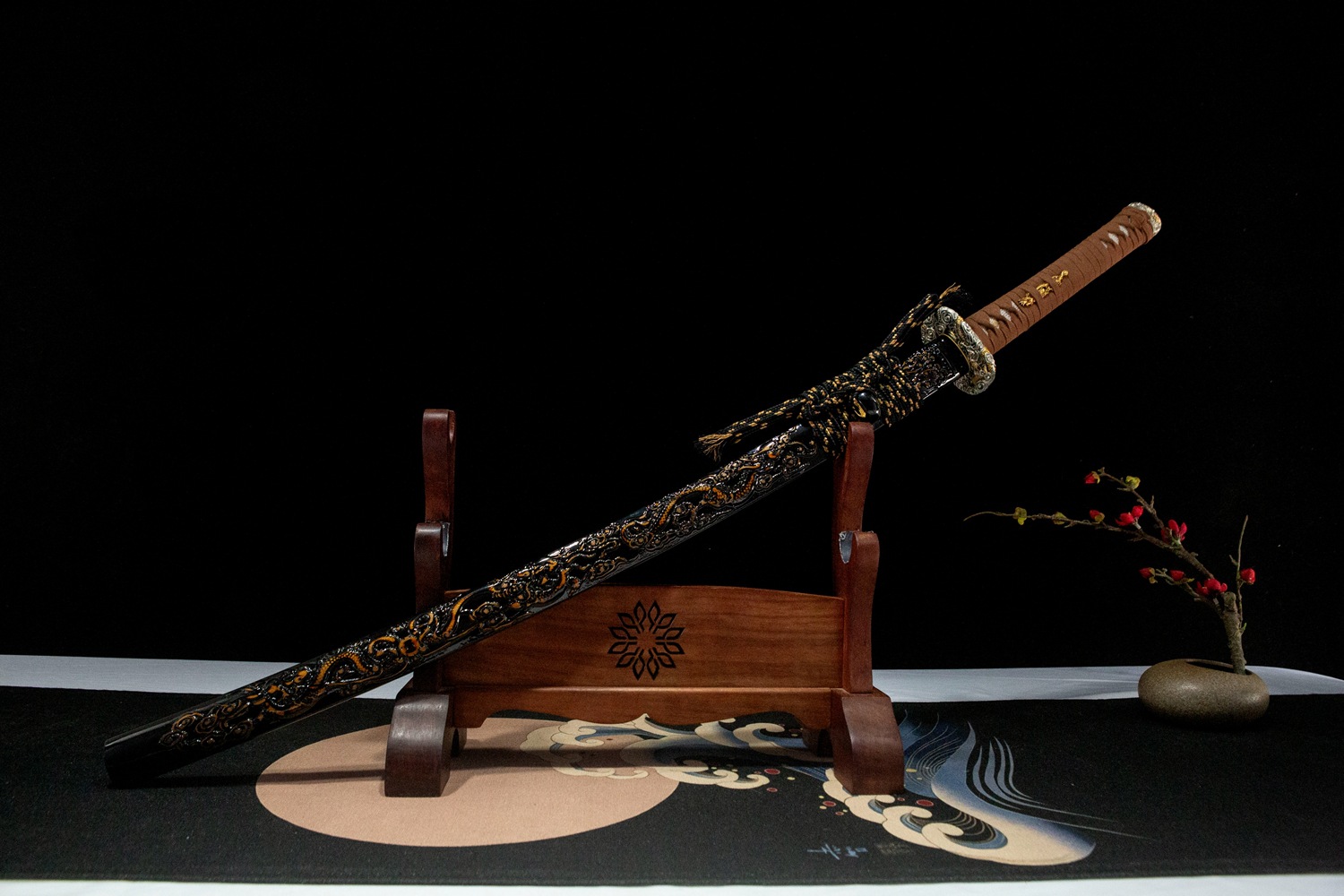 • Black Lacquered Wood Saya: Hand-carved hardwood scabbard with protective coating